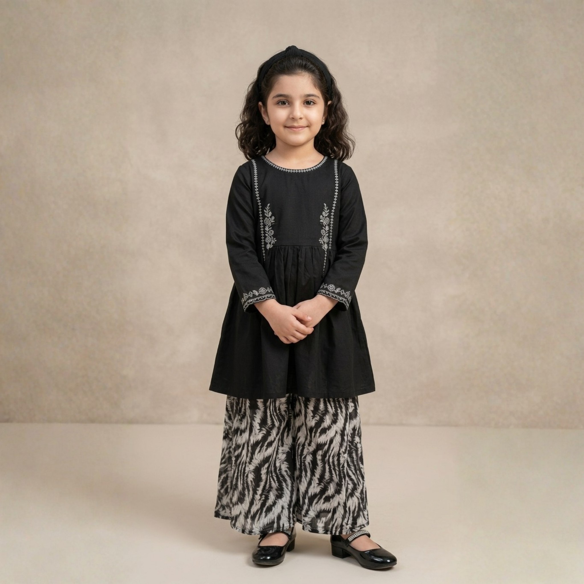 Paired with a bold printed plazo featuring a unique pattern, this outfit creates a fashionable contrast that stands out. The lightweight lawn fabric keeps your child cool and comfortable during hot summer days.