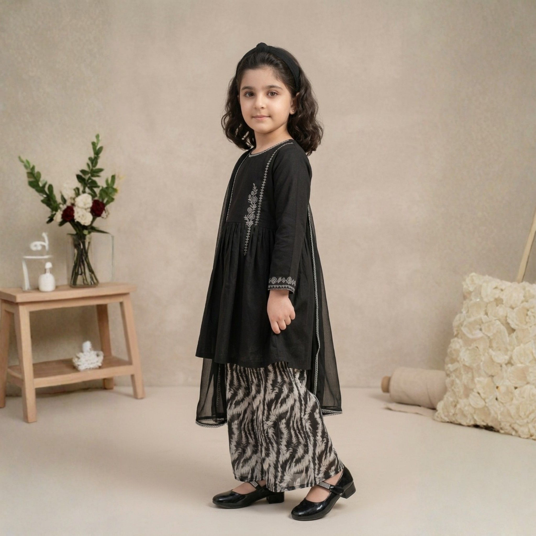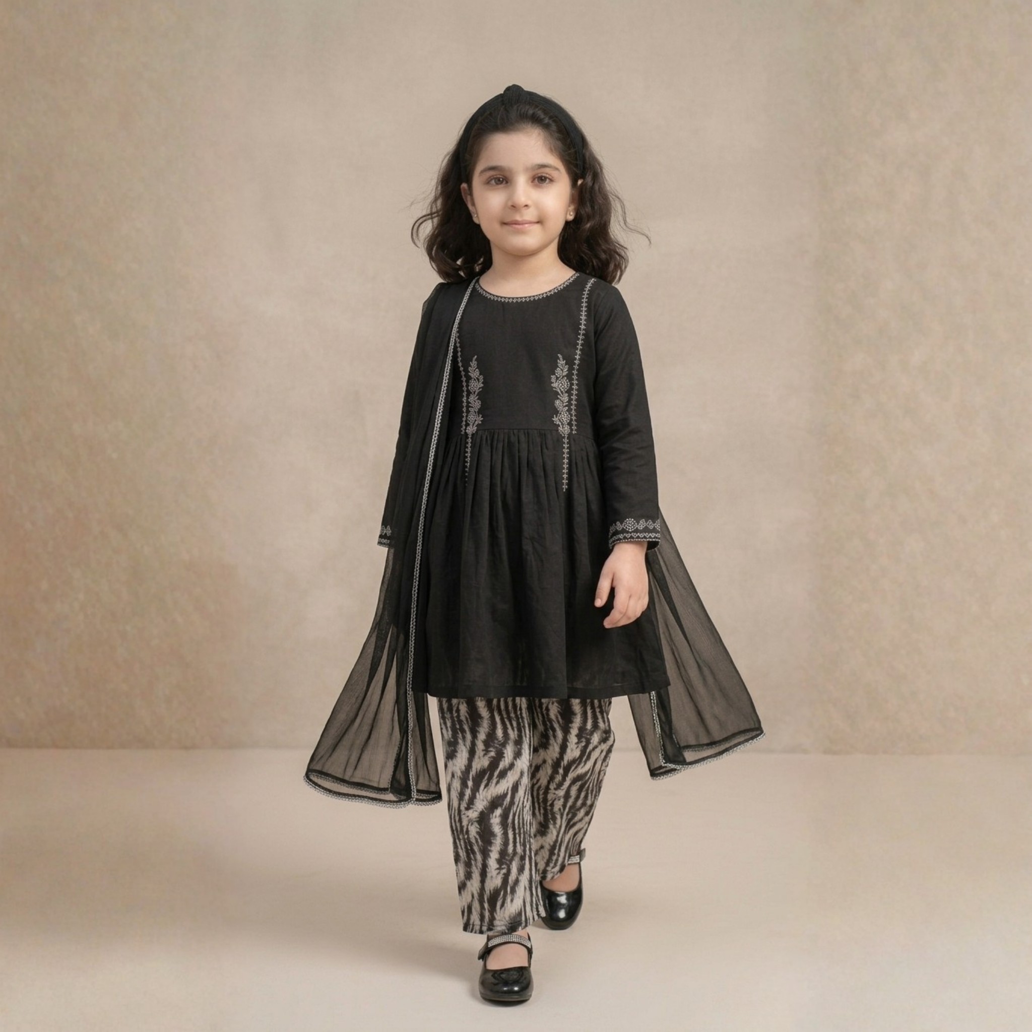 Upgrade your child’s everyday style with the Damsel Kids Black Embroidered Lawn Frock with Printed Plazo. This trendy outfit blends modern fashion with traditional elements, making it perfect for both casual and semi-formal wear.