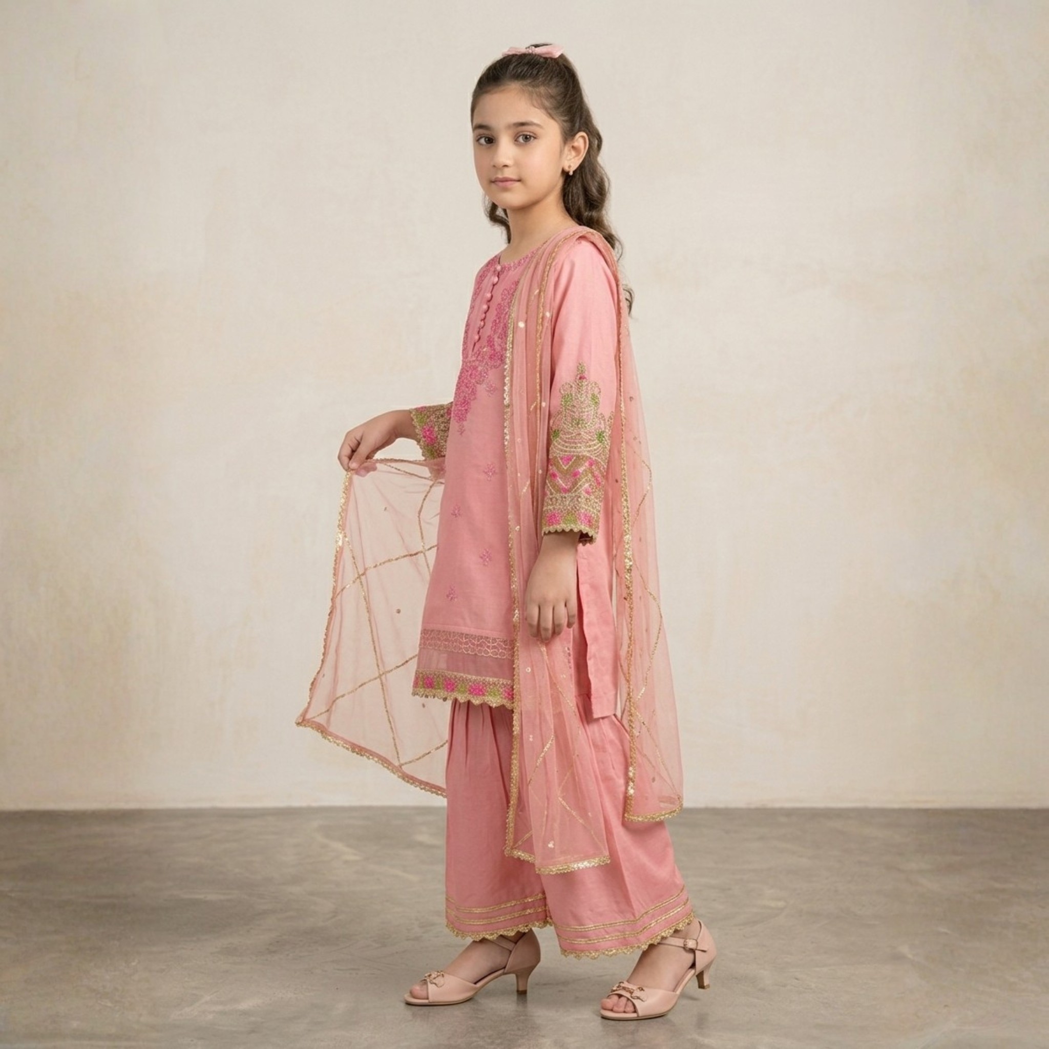 Add elegance to your child’s festive wardrobe with the Damsel Kids Embroidered Lawn Sharara Set with Net Dupatta. Designed in a soft light pink shade, this outfit blends traditional charm with modern style.