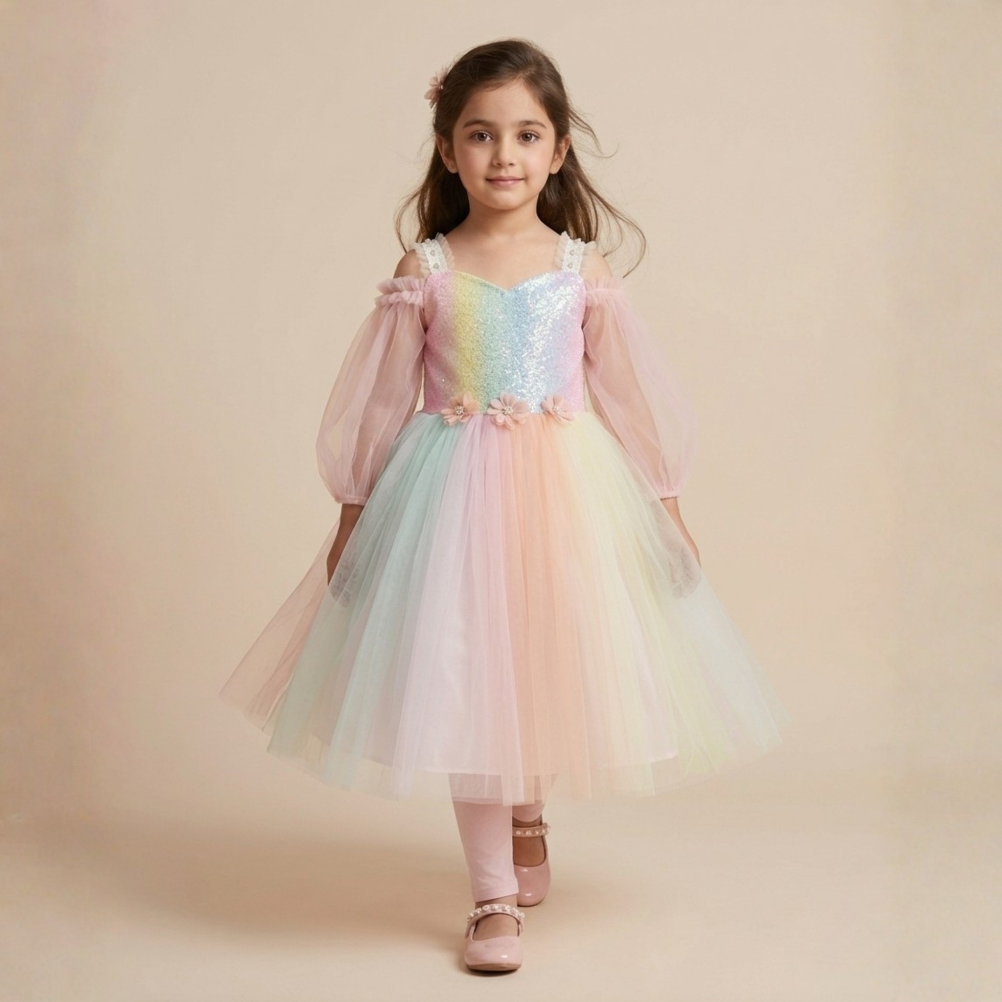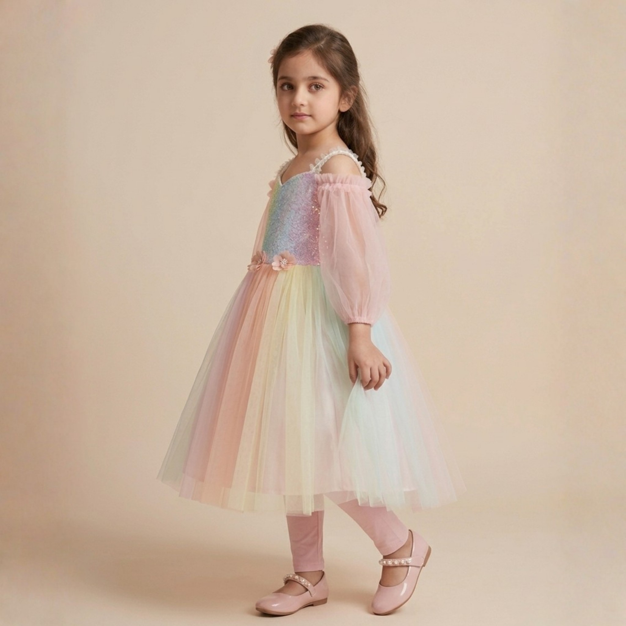The bodice features a soft shimmer finish with stylish off-shoulder detailing and delicate straps, giving it a modern princess vibe. The lightweight fabric ensures comfort while maintaining a premium, dressy look.