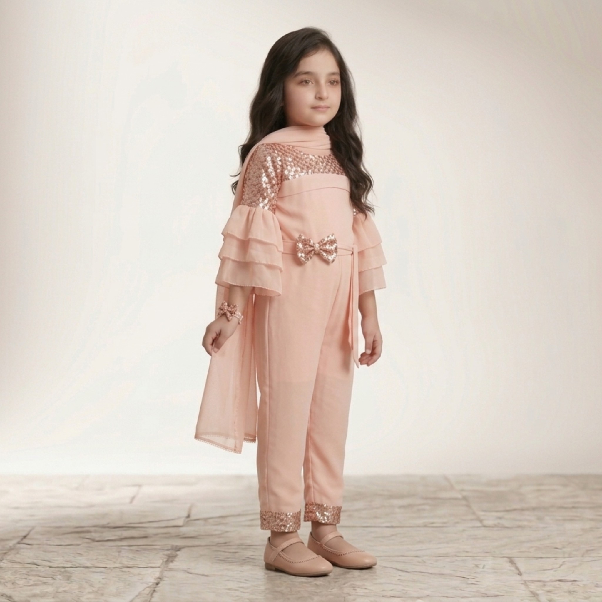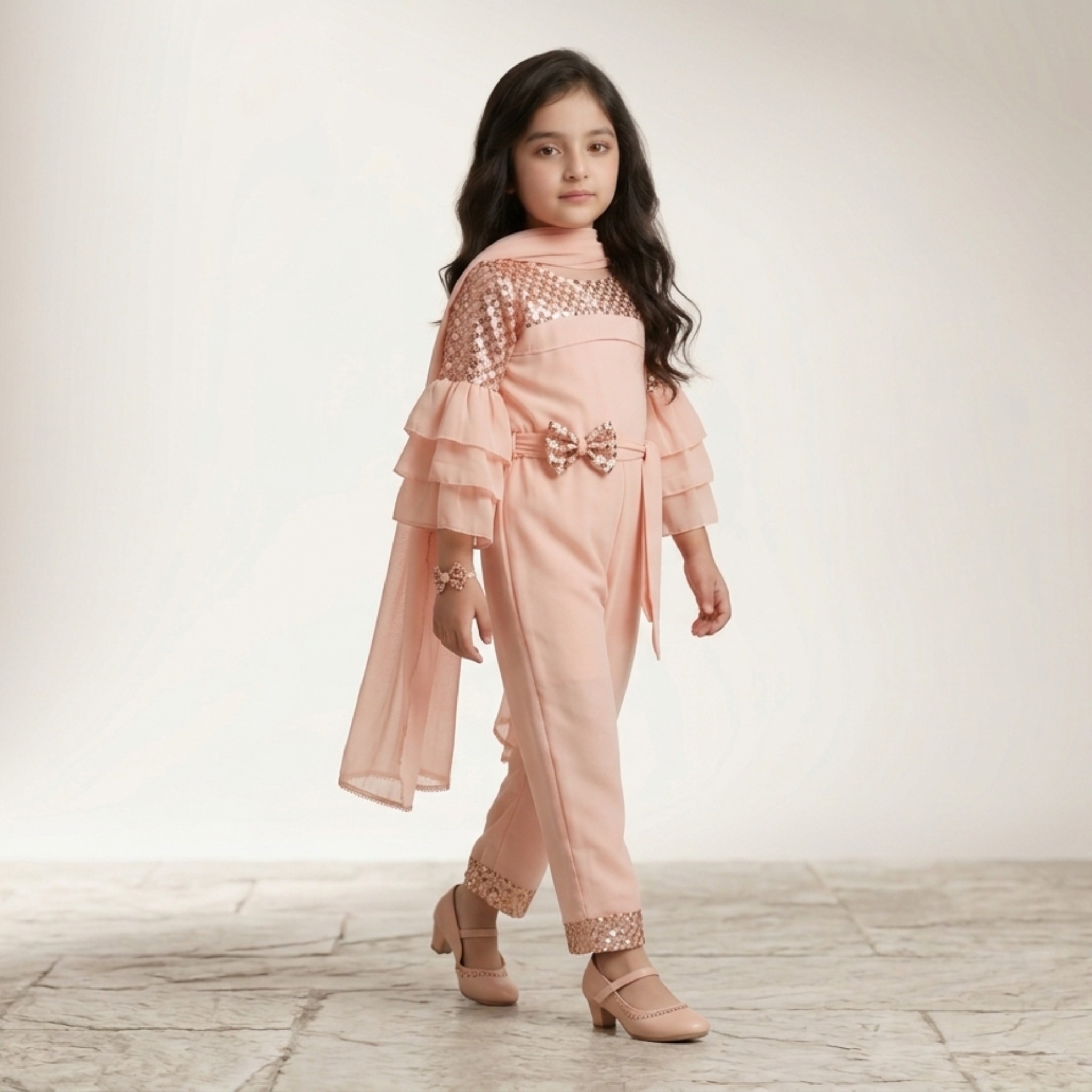 Let your little one shine in style with the Damsel Kids Chiffon Fancy Sequin Jumpsuit. Designed in a soft peach tone, this outfit blends elegance with modern fashion, making it perfect for special occasions.