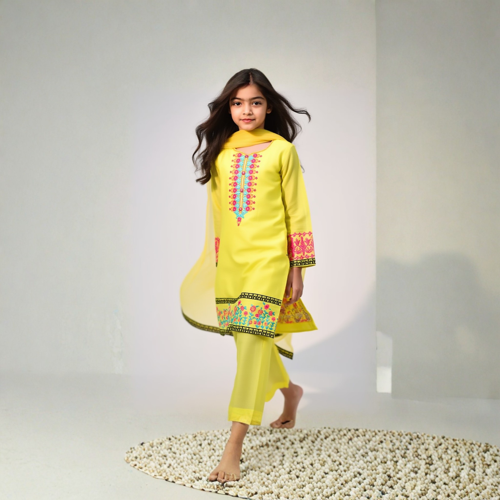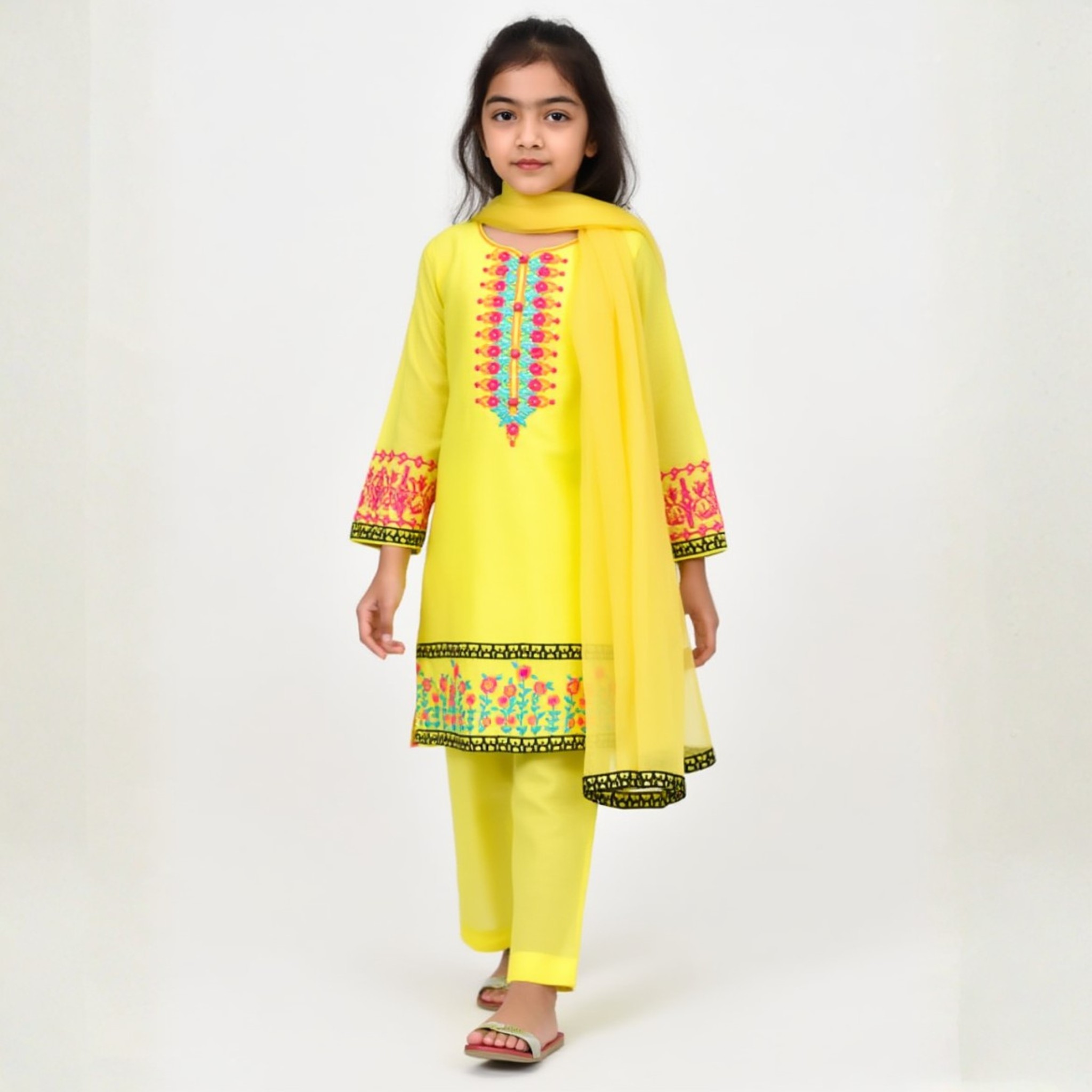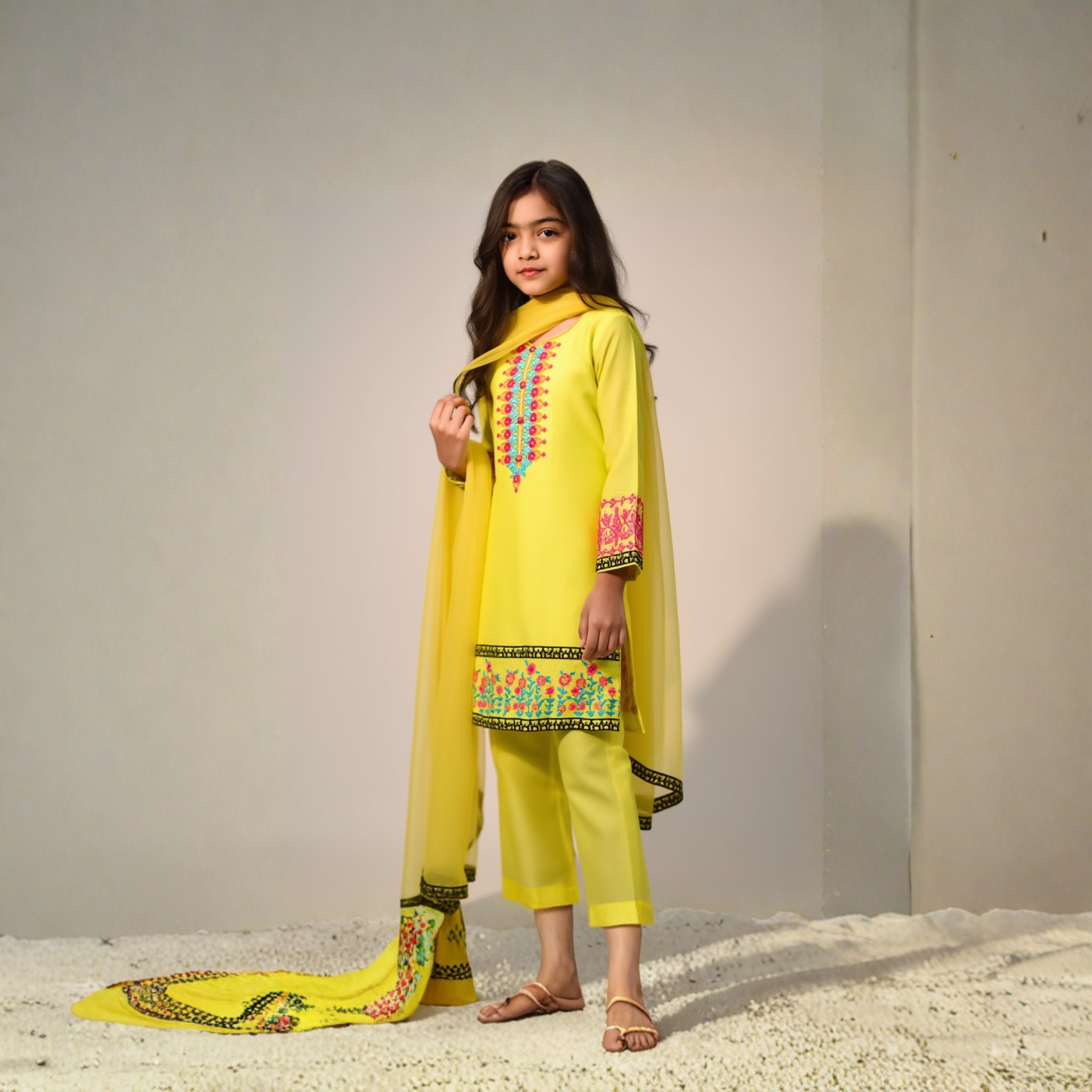 Add a pop of color to your child’s wardrobe with the Damsel Kids Pure Lawn Embroidered 3PC Suit in vibrant yellow. Designed for both comfort and style, this outfit is perfect for summer days, casual outings, and festive occasions.