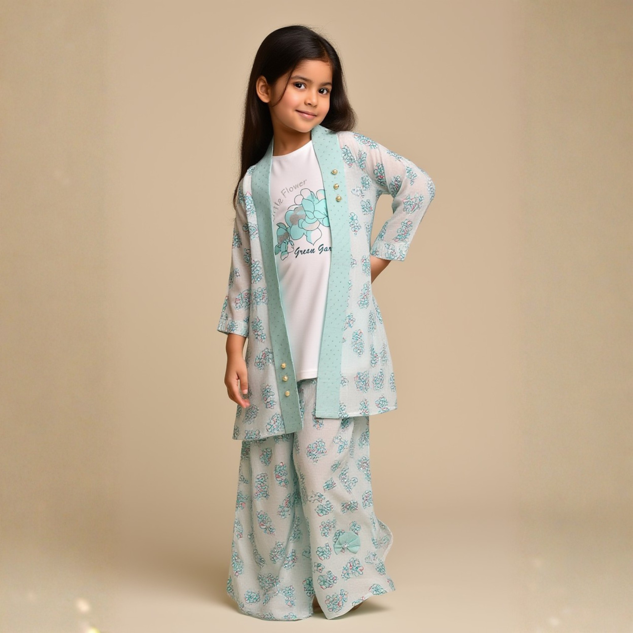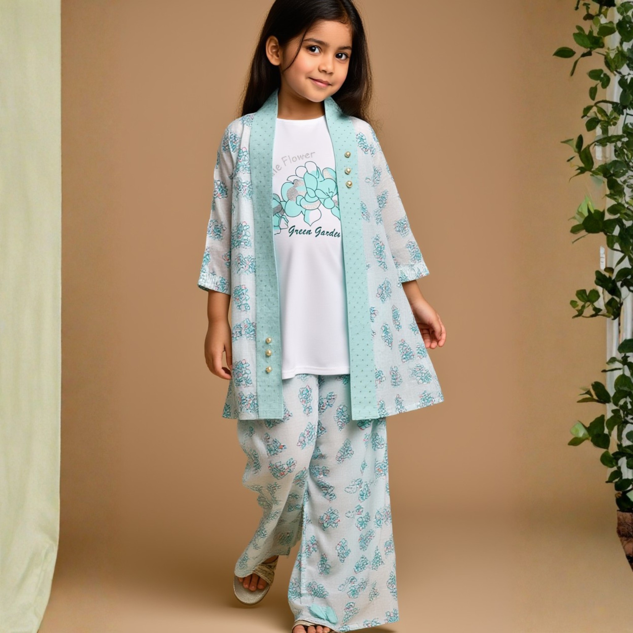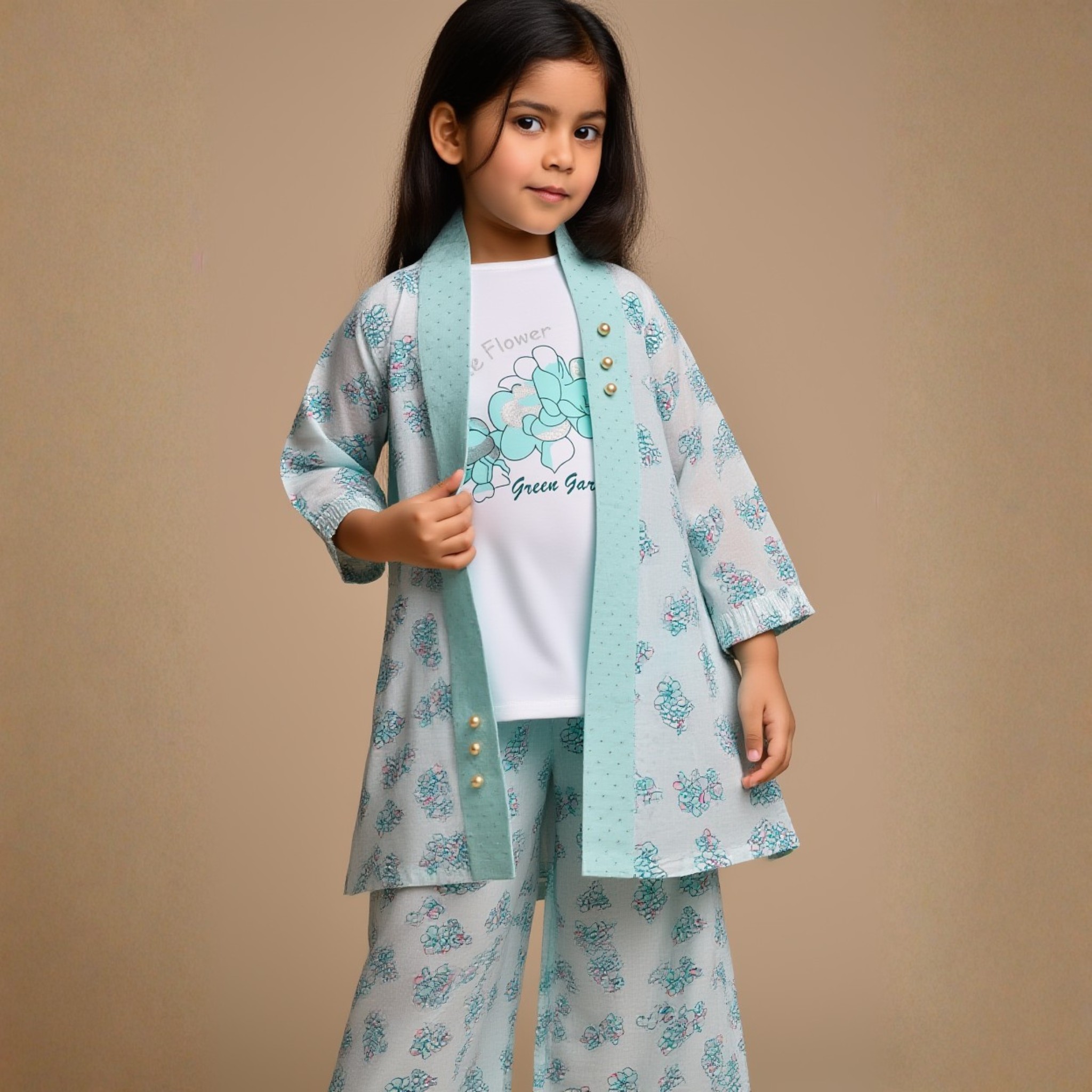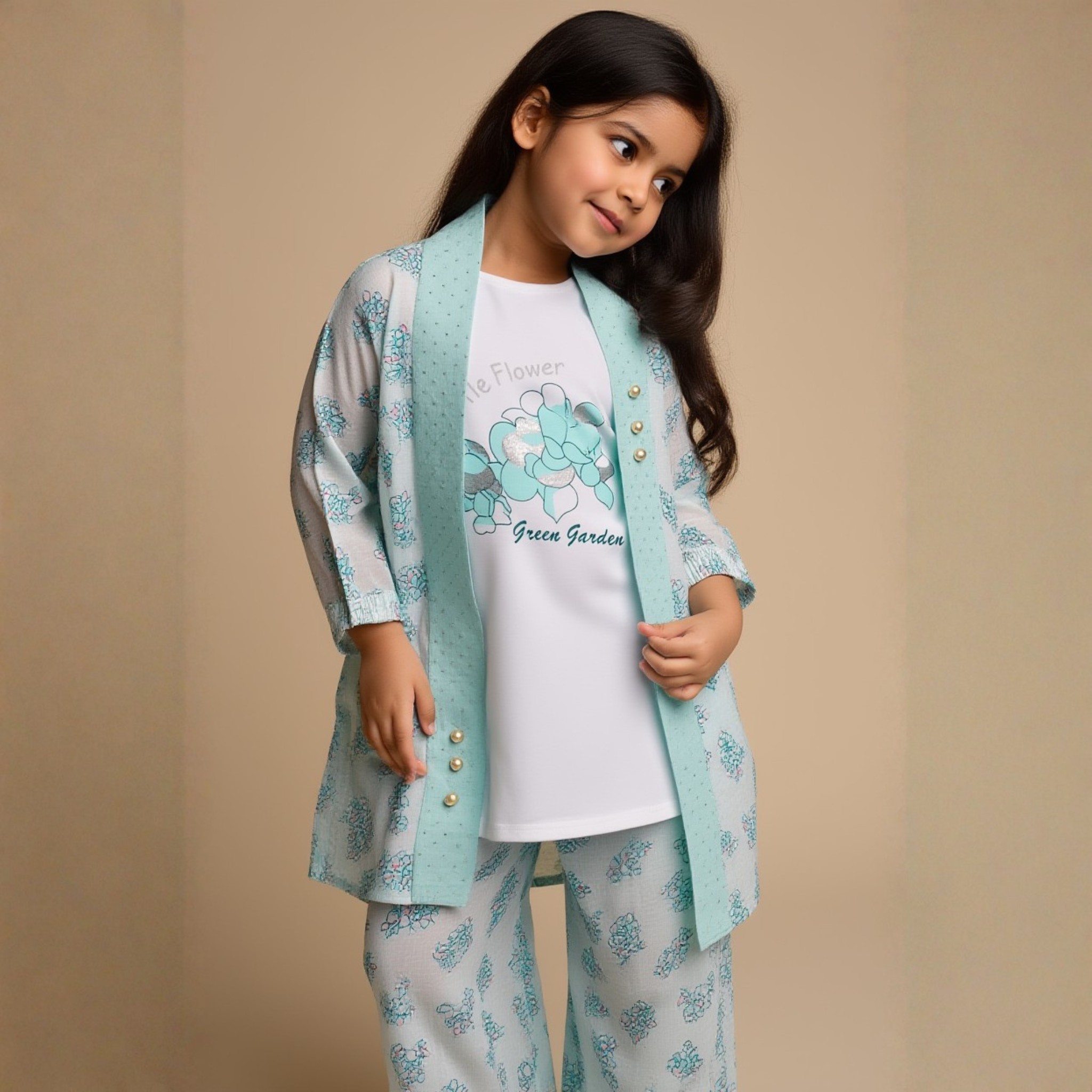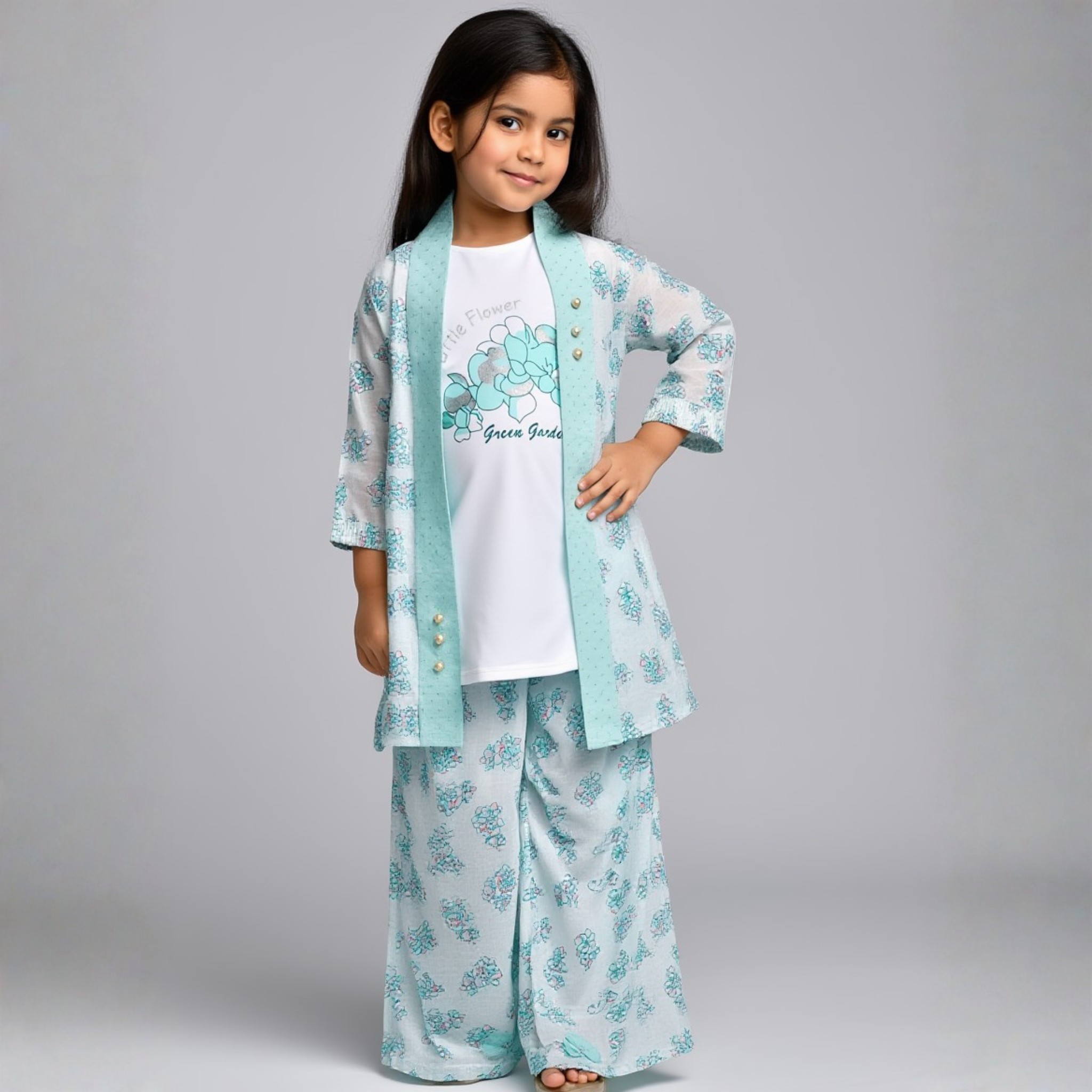 Upgrade your child’s summer wardrobe with the Damsel Kids Sky Blue Floral Lawn Coat Set. This beautifully coordinated 3-piece outfit includes a printed lawn coat, a soft inner shirt, and matching trousers—designed for a modern yet comfortable look.